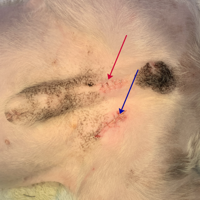 - 切開部位:猫=腹部中央臍後方の最後位乳頭前方犬=臍部分から切開