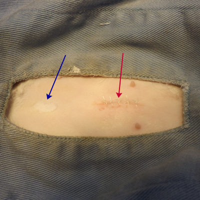 赤い矢印:切開部位 青い矢印:臍